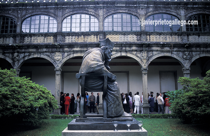 Alonso III de Fonseca fundó el colegio para estudiantes de Teología en el solar en el que estuvo ubicada la casa de sus abuelos. Este colegio se considera el origen de la Universidad compostelana. En 1524, tras la muerte del cardenal Cisneros fue arzobispo mitrado de Toledo. Estuvo muy relacionado con la Corte y llegó a bautizar, por deseo de Carlos V, a Felipe II en Valladolid. [En la imagen, inauguración de una exposición en el claustro del colegio de Fonseca, en Santiago de Compostela. En el centro del patio, la estatua de Alonso III de Fonseca recuerda a su fundador. La estatua fue colocada en 1995 para conmemorar el quinto centenario de la Universidad compostelana. Santiago de Compostela. A Coruña. España. © Javier Prieto Gallego]